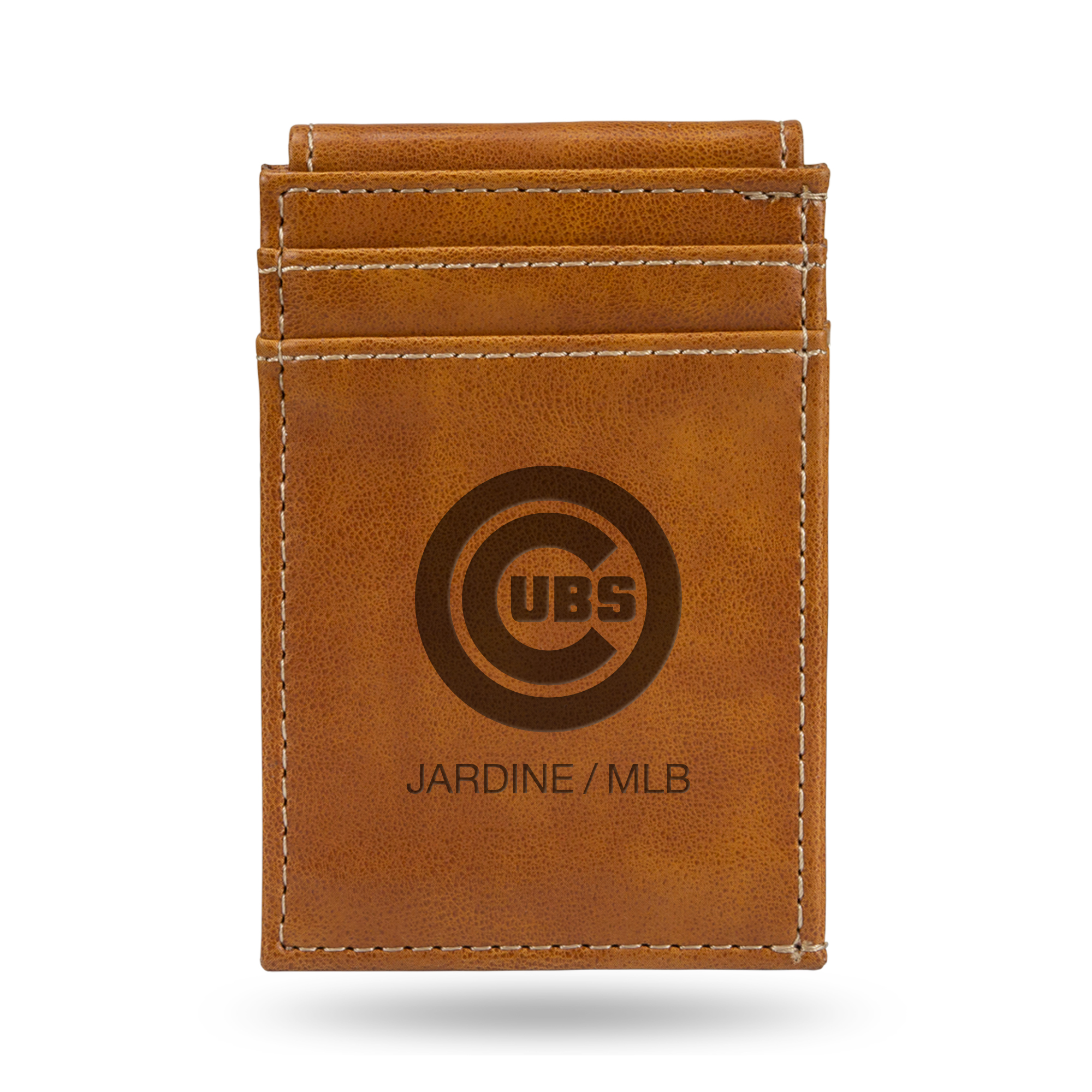 Take your team spirit everywhere you go with the Chicago Cubs Front Pocket Wallet. Featuring a faux leather design and slim profile, this wallet has plenty of room for your cash and cards. And the laser-engraved graphics let you show your Chicago Cubs pride while you keep your essentials secure.