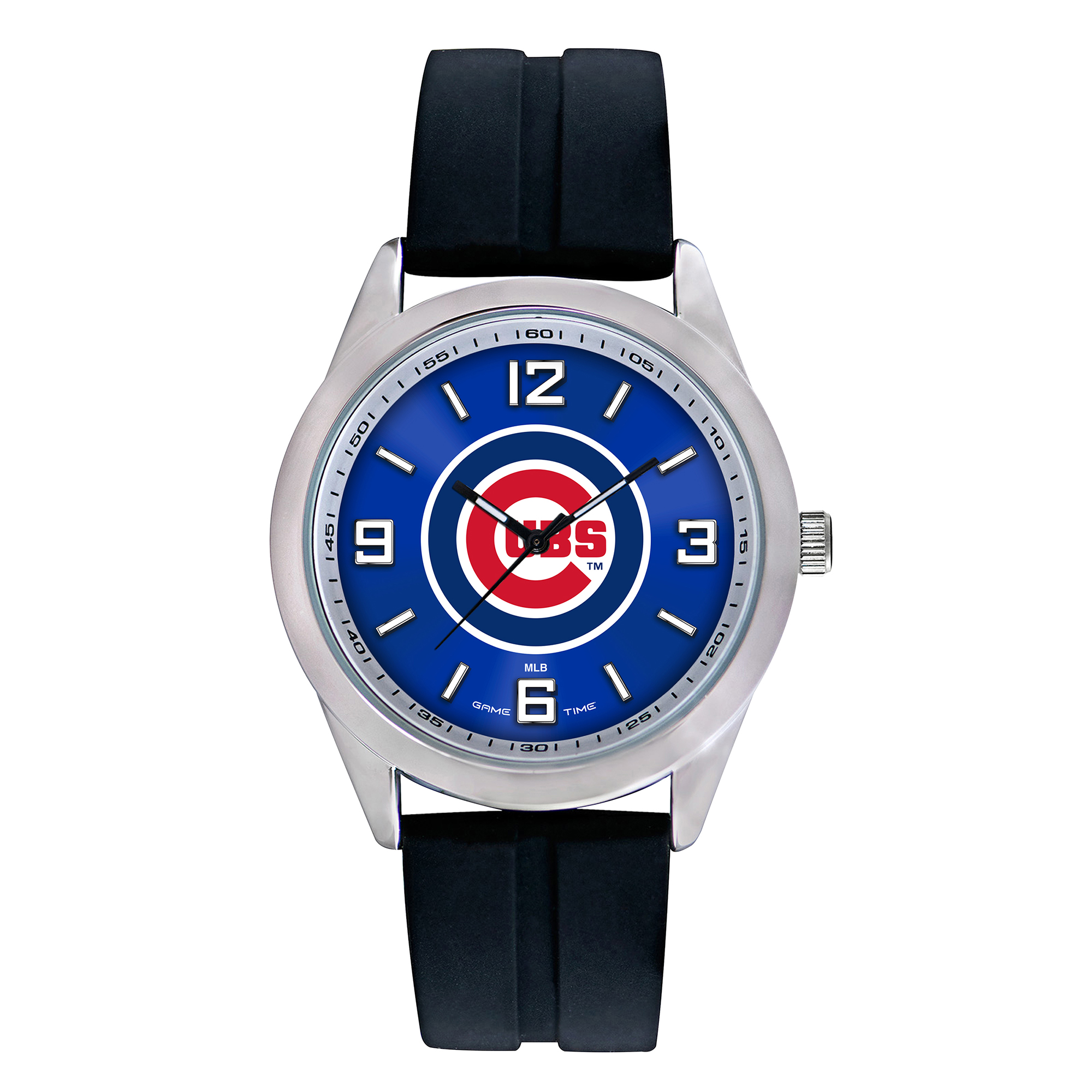 Keep track of every second with this Chicago Cubs Playmaker Watch. This stylish timepiece boasts the Chicago Cubs iconic logo and colors prominently displayed on the dial. The silicone strap, fastened with a durable stainless-steel sports buckle, provides a comfortable and secure fit for cheering on your favorite team.