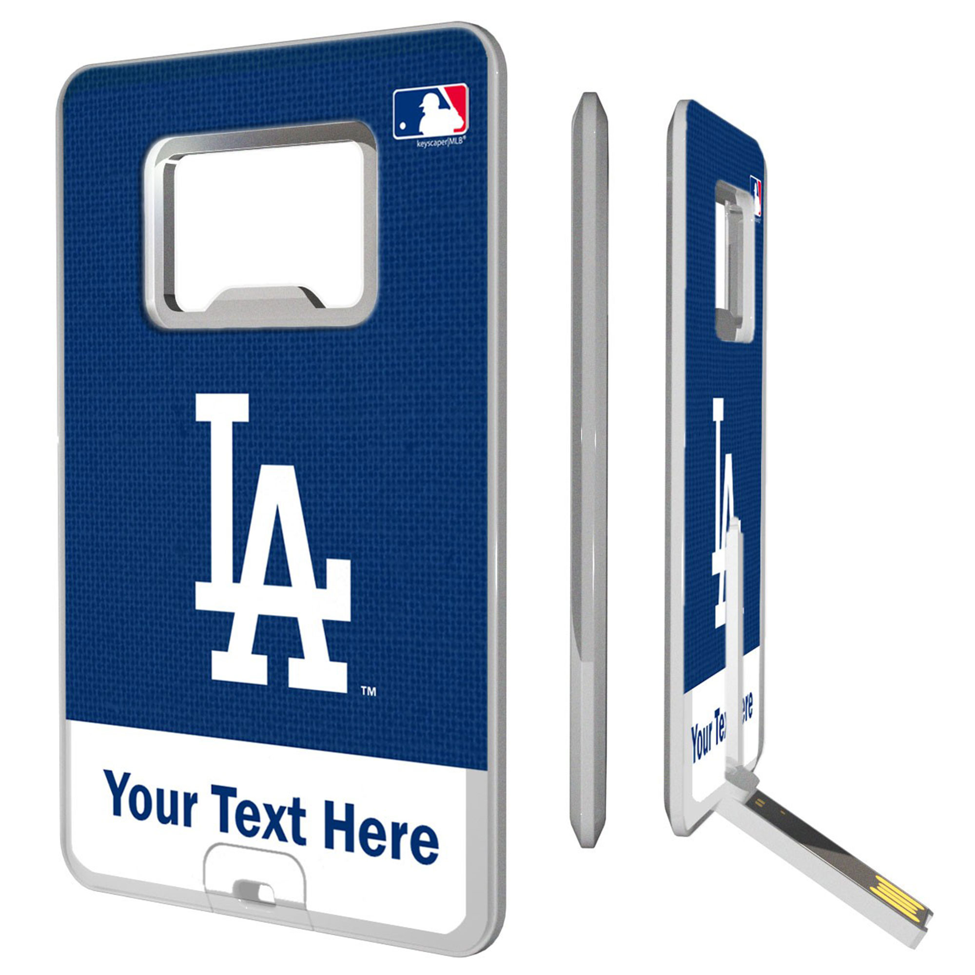 We want fans to celebrate their fandom by customizing and personalizing certain products. For these customizable products, including jerseys, we invite customers to tell us how they would like their preferred name or other text to appear by typing that text into the field indicated. However, just because a customer is able to type proposed customization text into the field and is able to complete the order through the website, not all proposed customization text will be accepted. Please note, Fanatics may reject and cancel any customization order for any reason, including for messages that are deemed offensive or inappropriate. Whether you’re working hard or hardly working, this Los Angeles Dodgers Personalized Credit Card USB Drive & Bottle Opener is perfect for you. The 16GB USB drive features printed Los Angeles Dodgers graphics. The sleek credit-card shape will allow you to take it anywhere and keep your information protected.