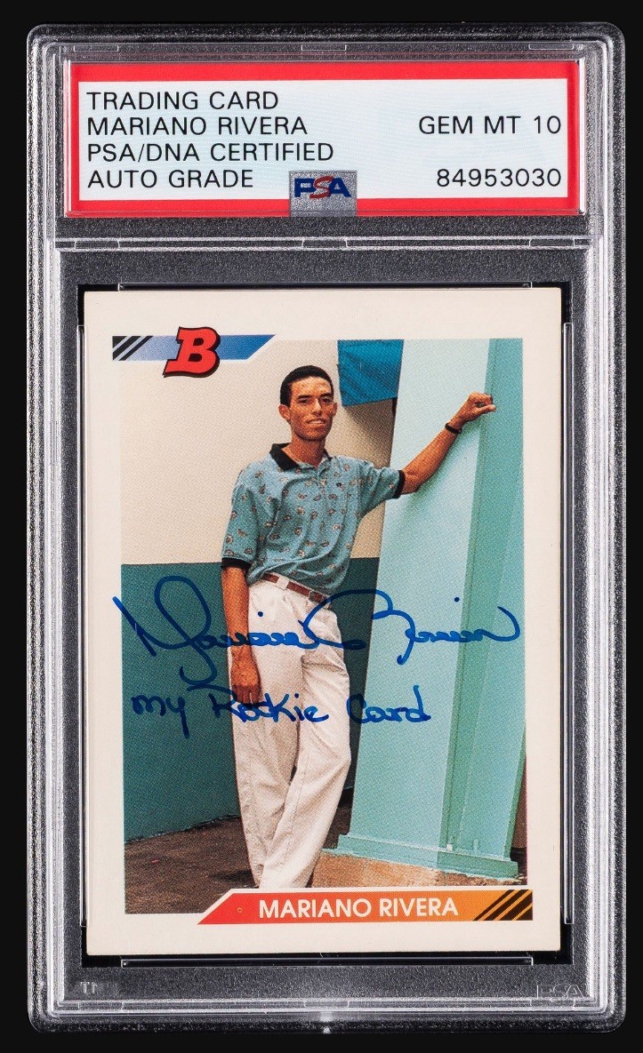 The ultimate addition to any Yankees PC! This is the iconic 1992 Bowman #302 Mariano Rivera Rookie Card featuring a perfect PSA/DNA Gem Mint 10 signature.