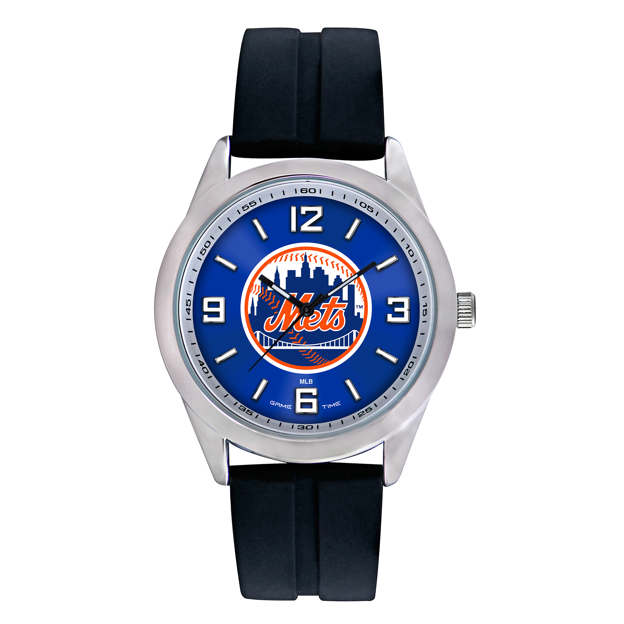 Keep track of every second with this New York Mets Playmaker Watch. This stylish timepiece boasts the New York Mets iconic logo and colors prominently displayed on the dial. The silicone strap, fastened with a durable stainless-steel sports buckle, provides a comfortable and secure fit for cheering on your favorite team.