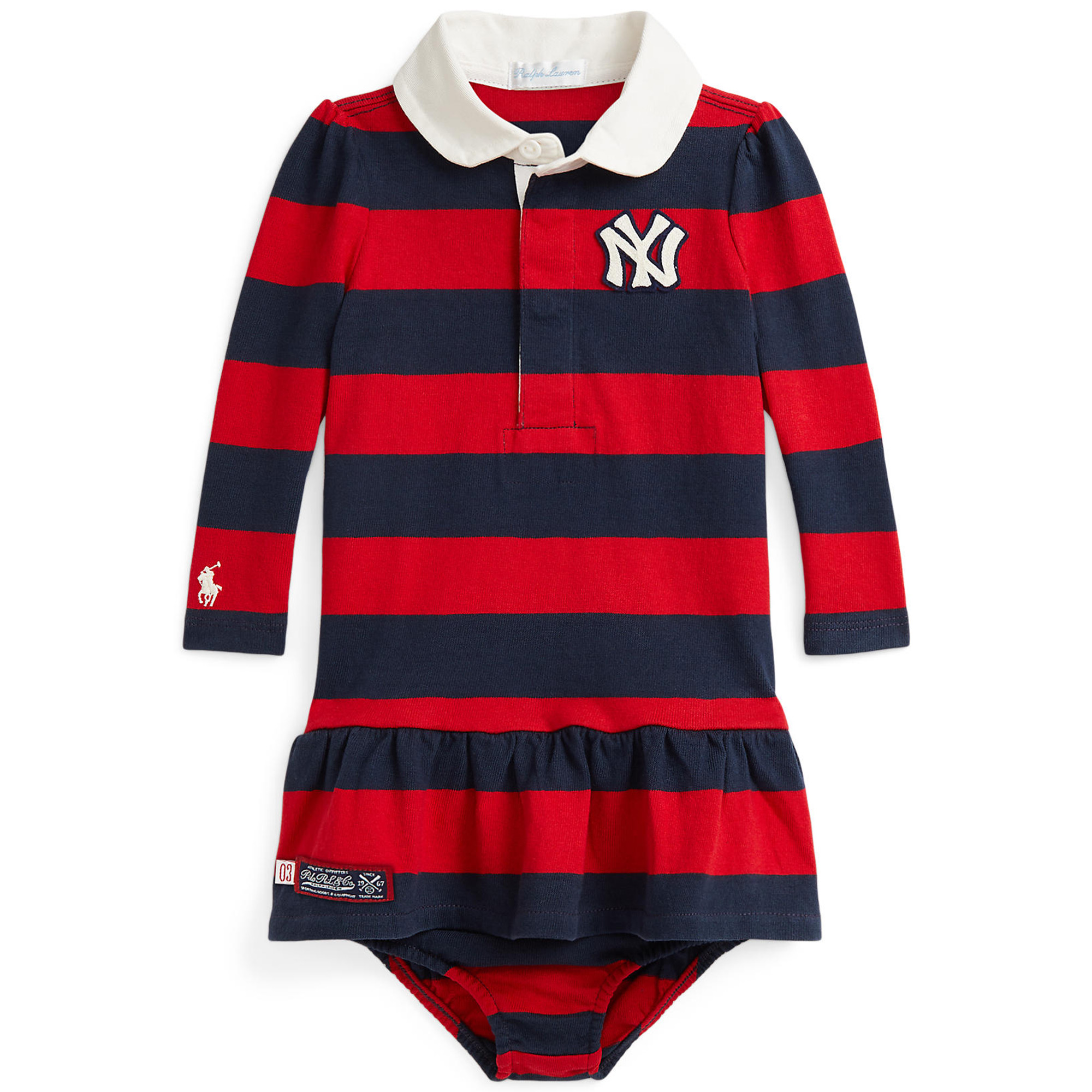 As a boy growing up in the Bronx, Mr. Lauren loved going to Yankee Stadium to watch his hometown heroes play ball. This rugby dress celebrates Mr. Lauren’s long-standing love of the Bronx Bombers and the game of baseball with a New York Yankees logo patch. Made with striped cotton jersey, it features our signature embroidered Pony and appliqus spelling out “New York.”