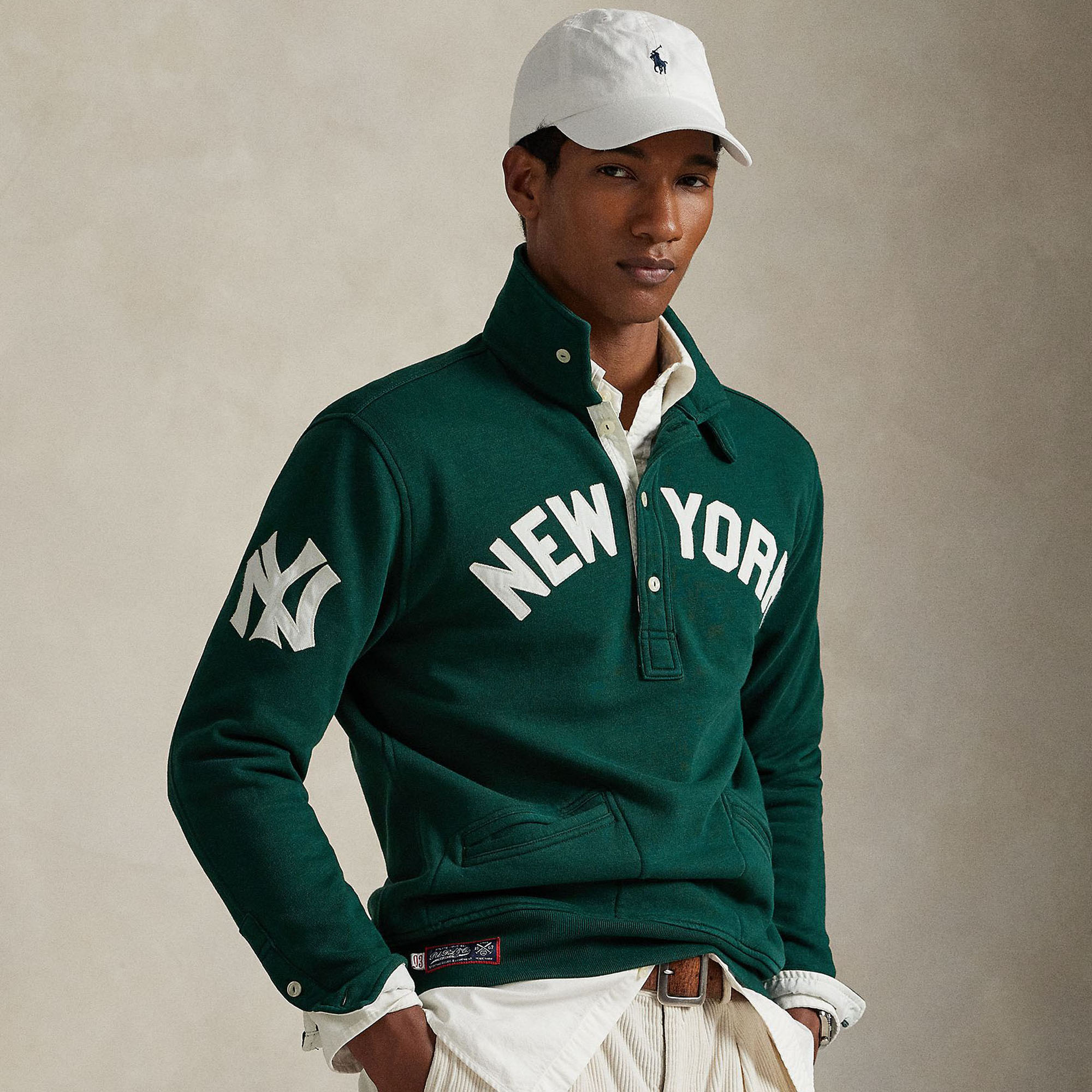 Show your support for the New York Yankees with this stylish Green Yankees Vintage Fleece Sweatshirt by Polo Ralph Lauren. The waffle-knit lining at the body and sleeves offers exceptional comfort and warmth, while the spread collar with buttoned throat tab adds a touch of sophistication. With twill appliqued team wordmark and team logo patch, this New York Yankees sweatshirt lets you display your team pride in premium style.