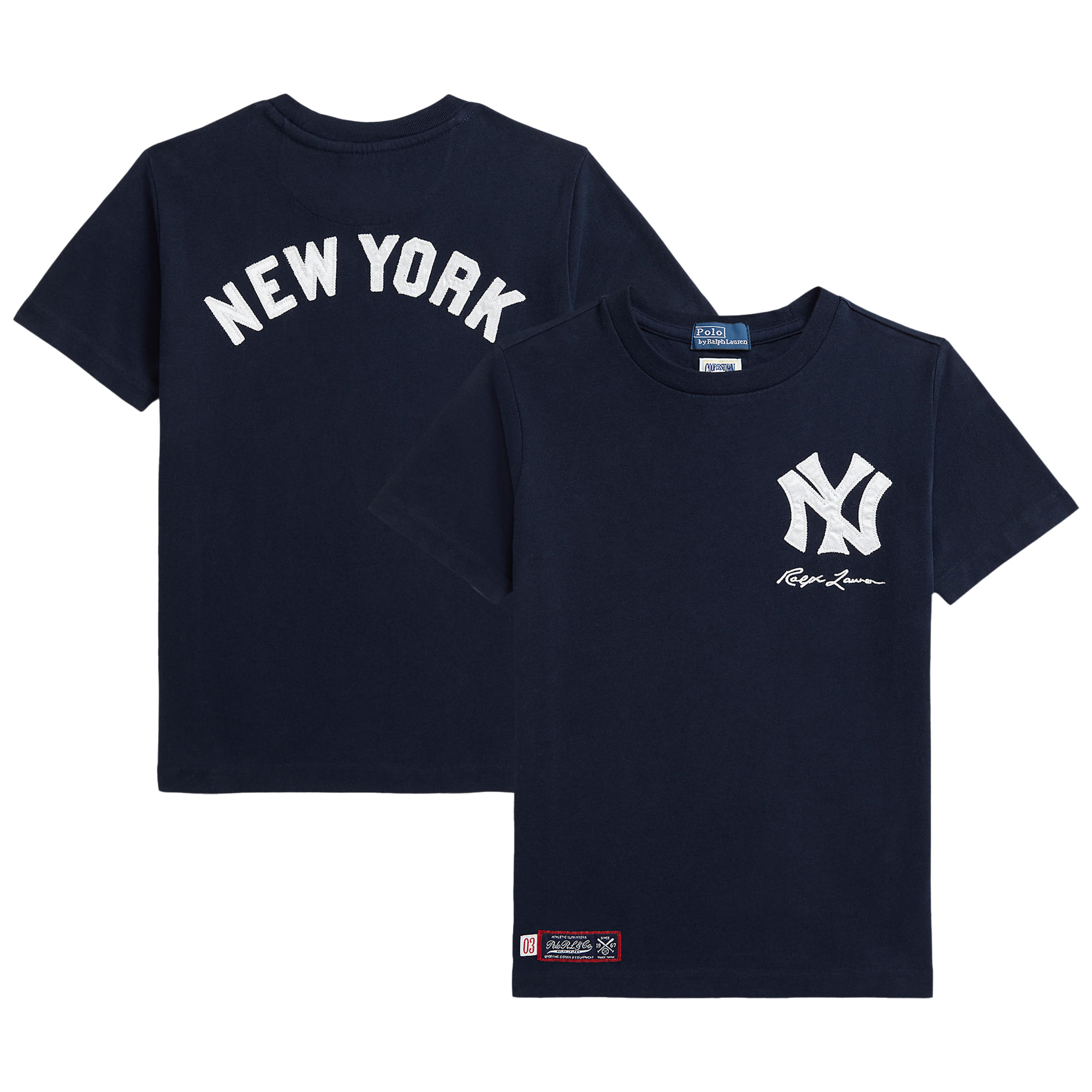 As a boy growing up in the Bronx, Mr. Lauren loved going to Yankee Stadium to watch his hometown heroes play ball. This unisex tee celebrates Mr. Lauren’s long-standing love of the Bronx Bombers and the game of baseball with a satin New York Yankees logo patch. Made with sueded cotton jersey, it features “Ralph Lauren” script embroidery and appliqus spelling out “New York.”