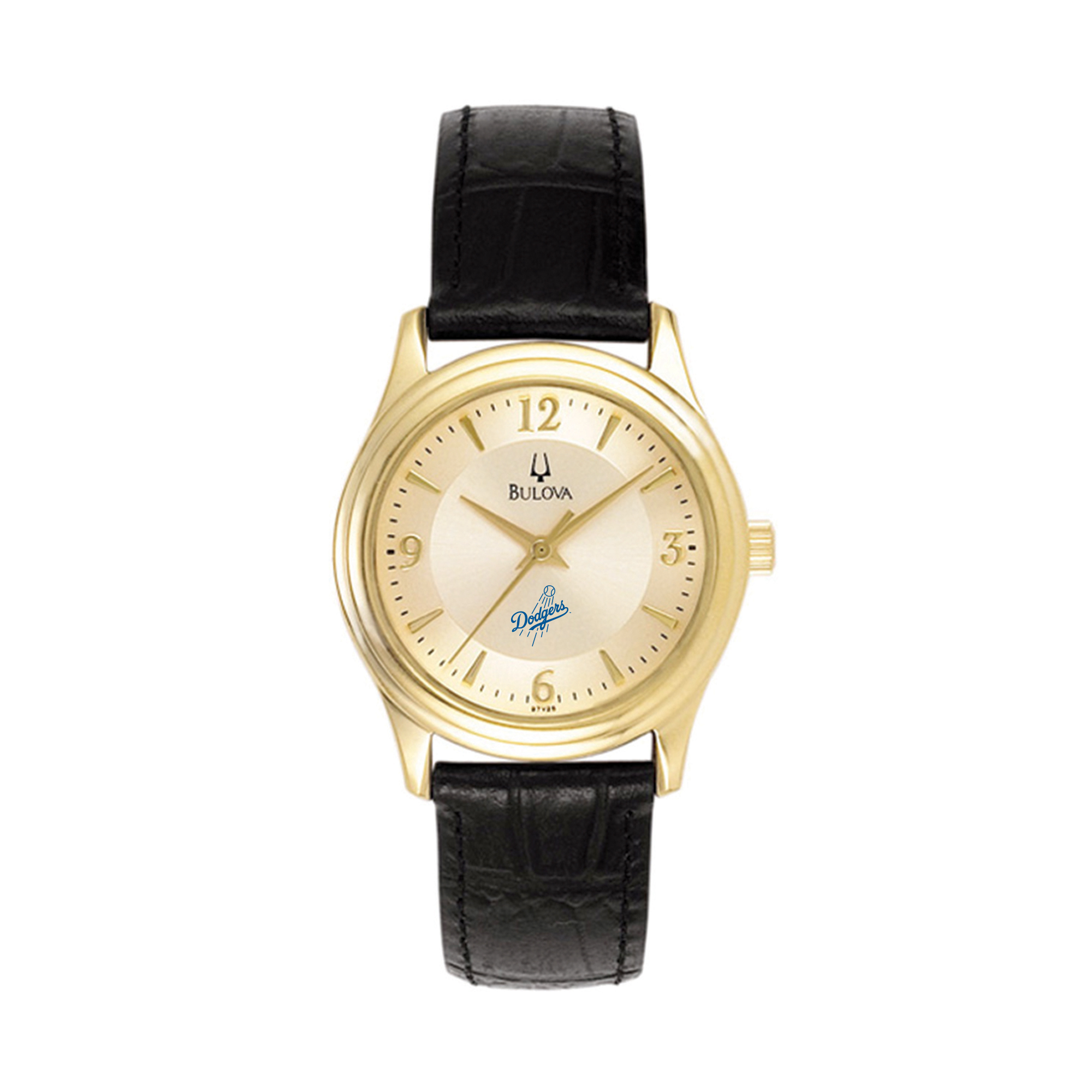 This Los Angeles Dodgers Leather Strap Watch was meticulously crafted by Bulova to provide an elegant and fashionable accessory that effortlessly highlights your team spirit. It showcases a round faced gold-tone gilt dialwith Arabic numerals for an elevated timepiece that is sure to become a favorite in your selection. Adjust the black leather strap to your preferred fit for a sleek piece of Los Angeles Dodgers flair that will add style to any look.