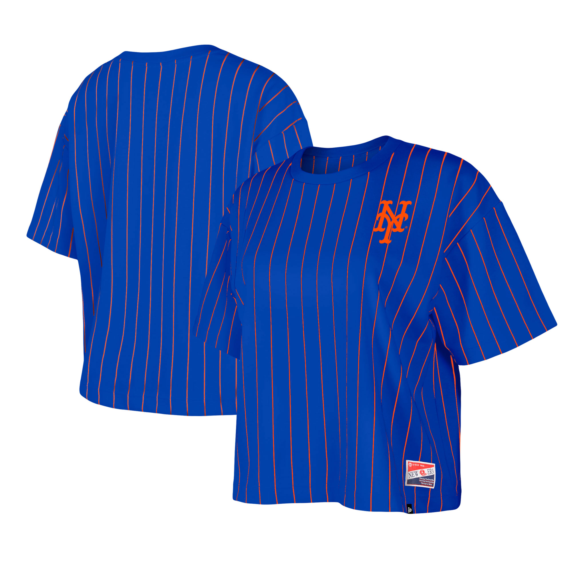 The Women’s New Era Royal New York Mets Boxy Pinstripe T-Shirt is a stylish and comfortable way to show your support for the New York Mets. Made from a soft cotton and polyester blend, this t-shirt features a boxy fit and pinstripe design that is sure to turn heads. The woven jock tag and screen print graphics add a touch of authenticity, making this t-shirt a must-have for any Mets fan. Whether you’re cheering on the Mets at the stadium or just relaxing at home, this t-shirt is the perfect way to show your team spirit.